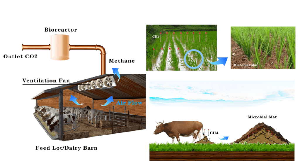 Agricultural operations with animals presents a significant source of methane release into the environment. Feedlot and dairy barn sites can be retrofitted with ventilation systems that pipe methane generated by animals through bioreactors which digest the methane before release. Manure waste that is decomposed can be collected and covered with a microbial mat or mixed in an aeration system to break down into denser fertilizer for reuse. Finally microbes can be deployed to rice paddies or other significant sources of methane to digest the gas as it is released.