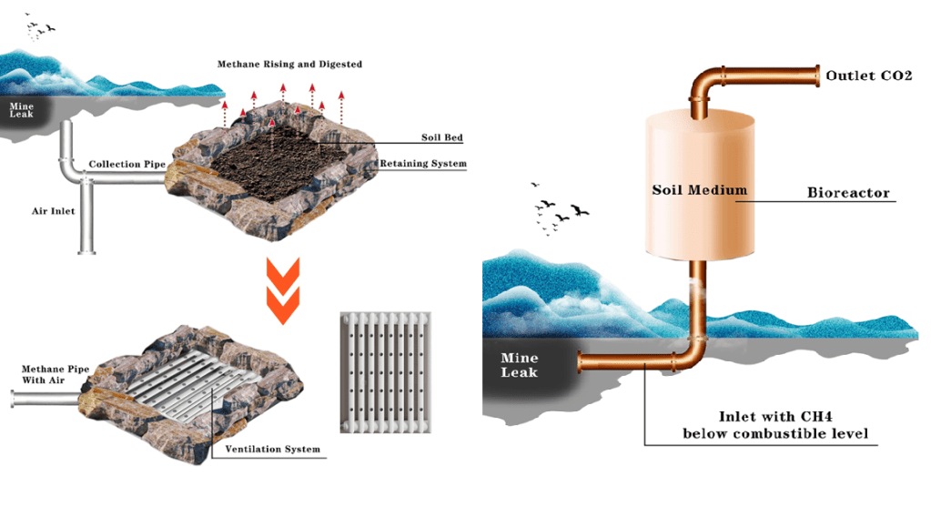 Mine sites often release significant streams of methane due disturbance from where the methane is naturally contained underground. Some of these can be burned off, but many are below combustible limits and provide a significant challenge in dealing with. Additionally many abandoned mines sites that are leaking methane are in inaccessible areas. A solution to dealing with these leaks would be the placement of small transportable reactors into these areas that require minimal human intervention. If a larger scale leak is on site then a larger open system can be installed.